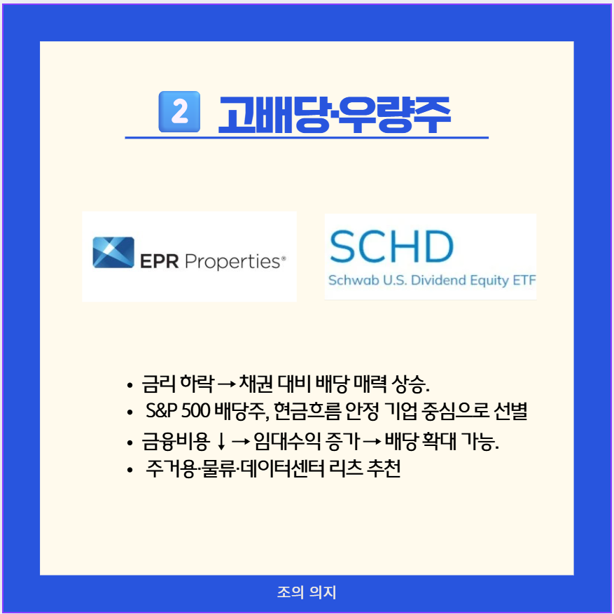 - 이유: 금리 인하는 채권 수익률을 낮춰 주식 배당 매력을 높임. 특히 안정적인 현금흐름을 가진 고배당주와 리츠