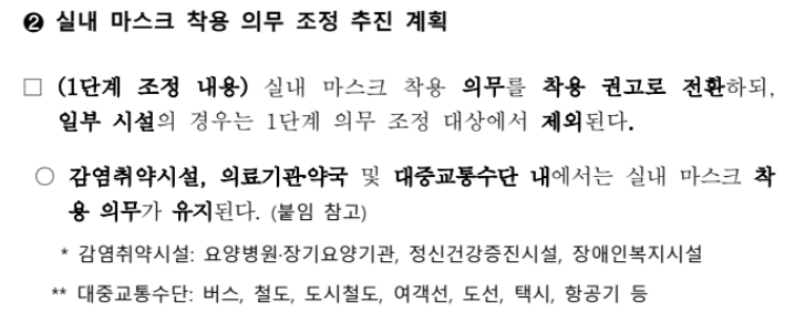 - 실내 마스크 착용 의무를 착용 권고로 전환하되, 일부시설은 1단계 의무 조정 대상에서 제외 됨.