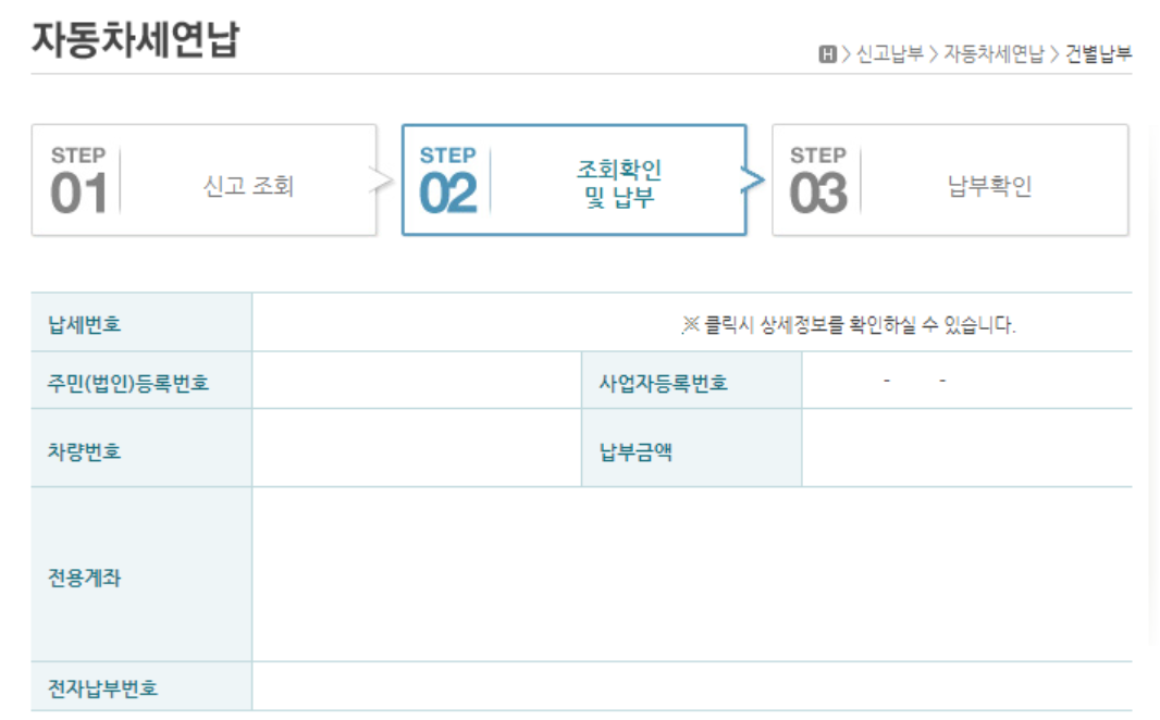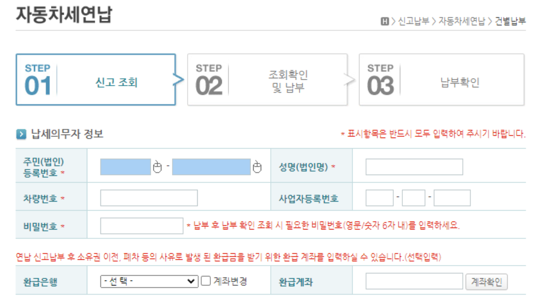 그러면, 아래와 같이 연납메뉴가 나옵니다. 개인 상세정보를 입력하면 내가 내야 할 자동차 세금액을 조회할 수 있습니다. 환급 계좌번호는 혹시나 1년 이전에 소유권을 이전하거나, 새 차를 구매할 때를 대비하여 작성하는 것이니 참고 바랍니다. (선택입력 사항)