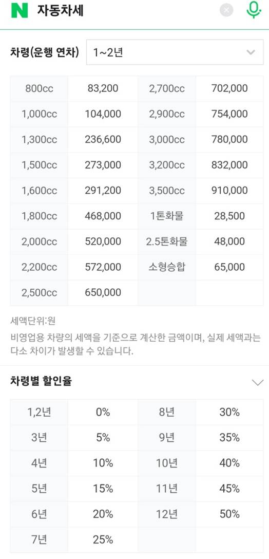 모바일 네이버에서 자동차세라고 검색하시면 운행연차, CC별로 내가 내야 할 세금을 개략적으로 확인할 수 있습니다.