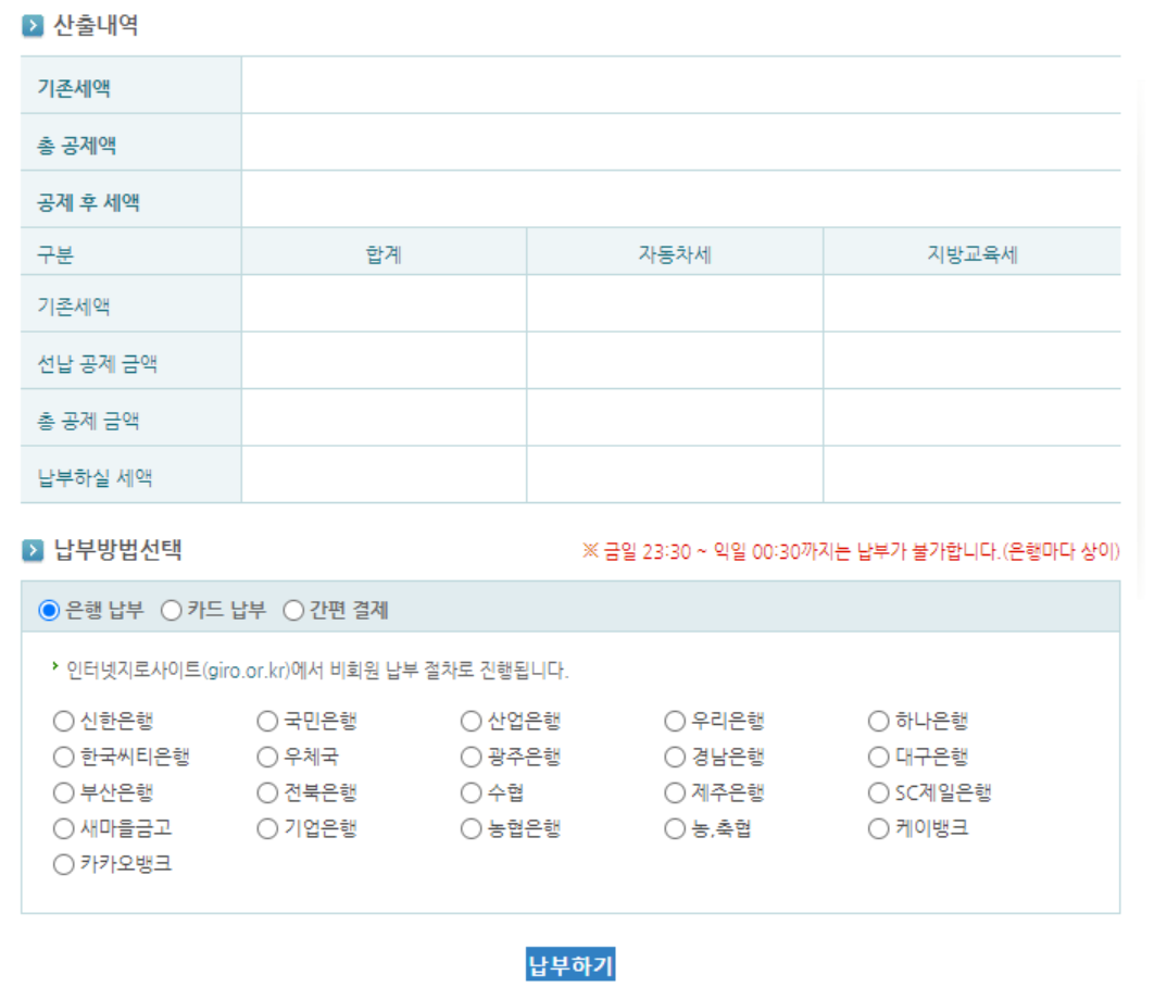 ※ 납부 시간은 평일 7시 ~ 22시, 토요일 7~15시, 공유일 불가이며 마감일의 경우 19시까지만 운영가능하니 참고 바랍니다.