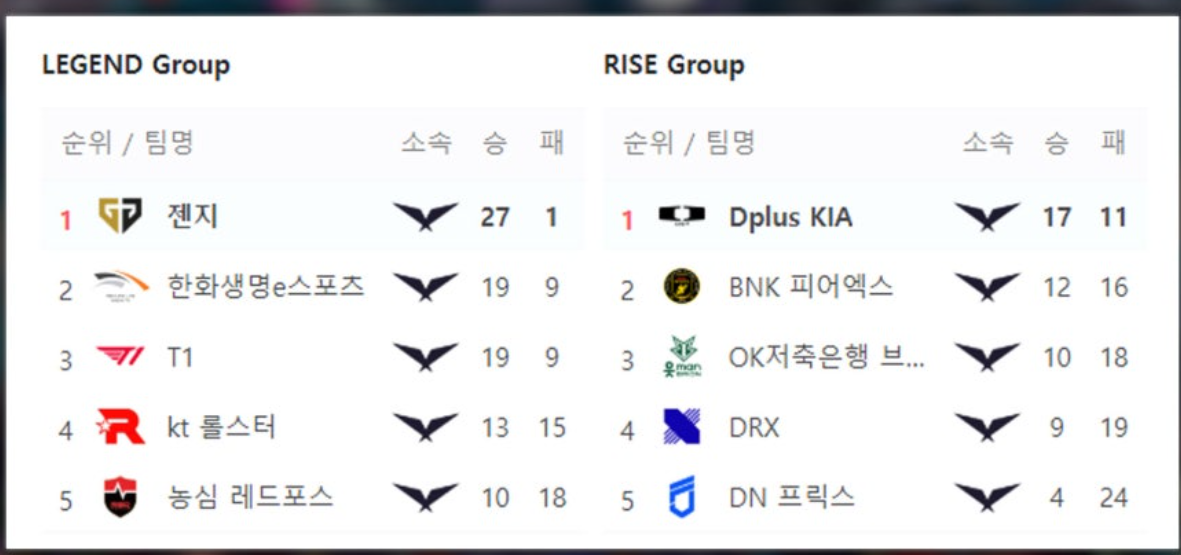 젠지는 이미 28승 1패라는 압도적인 성적으로 1위를 확정 지었습니다.