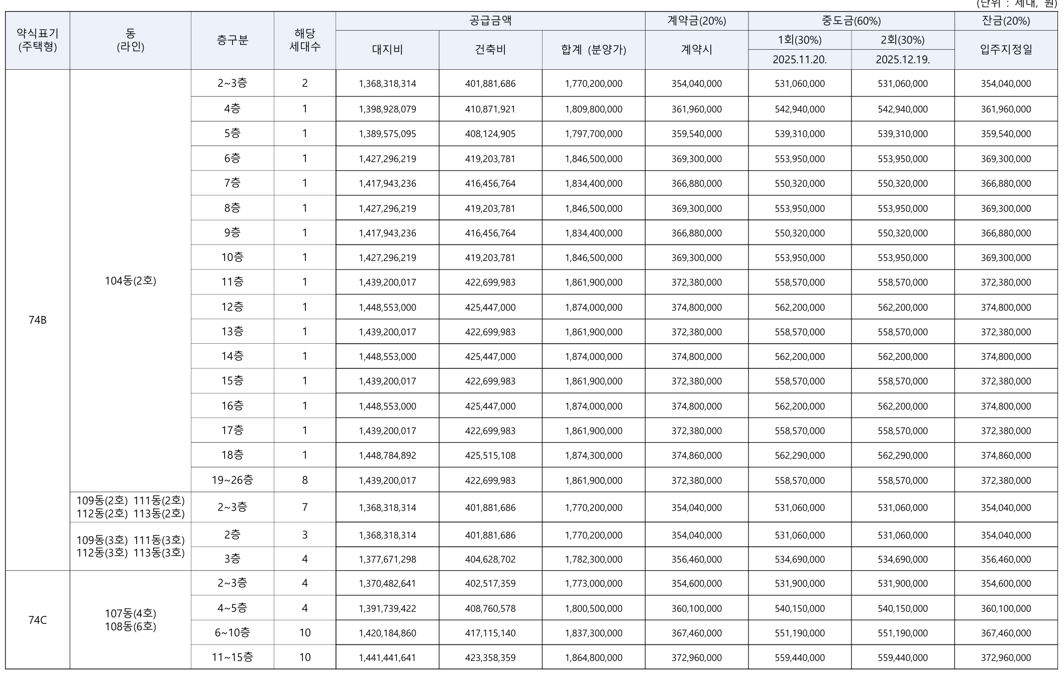 - 분양가: 주택형·층수에 따라 차등 / 발코니 확장, 옵션, 취득세 별도